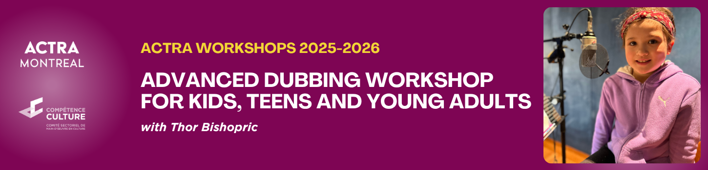 This Workshop is open to graduates of an ACTRA Professional Voice Workshop, as well as young performers who have professional experience (on ACTRA contracts) on dubbing projects.